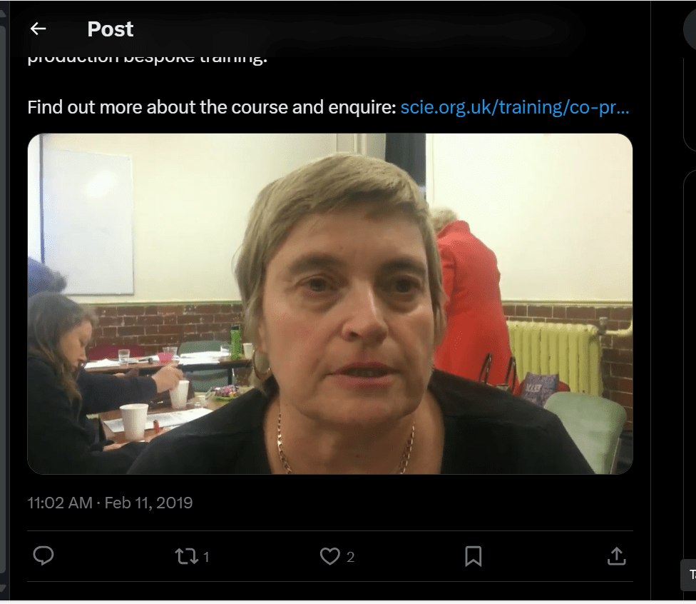 Go to: https://twitter.com/i/status/1094914520982654976 for Sue talking about a training session on Co-production