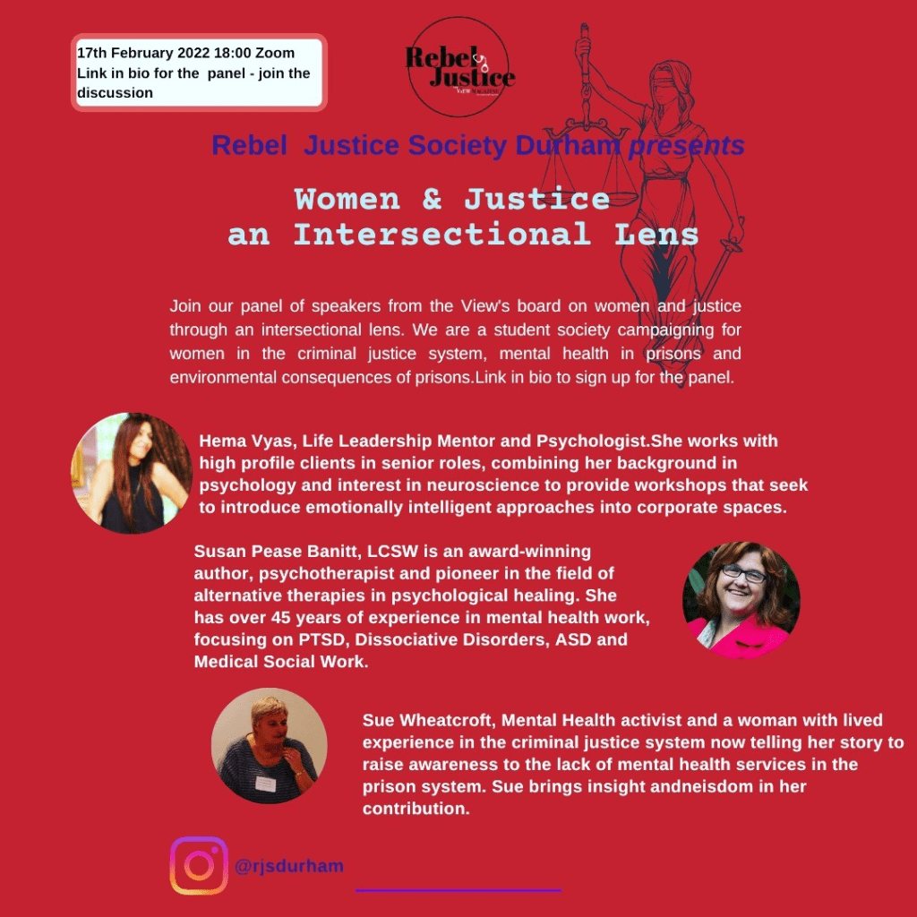 Narince Erkan introduces the Durham Rebel Justice Society and the session’s theme of viewing women and justice through an intersectional lens.